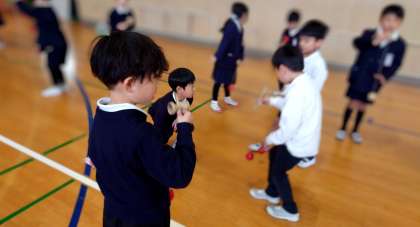 コマにけん玉、お手玉に羽子板。クラスごとにいろいろなあそびを楽しんでいました。