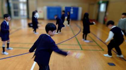 今日の4時間目は講堂で、むかしあそびを体験しました。