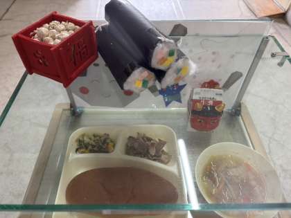 給食室前の給食の見本ケースに、節分の飾りが置かれていました。豆に恵方巻き。とてもよくできていて、子どもたちも大喜び。