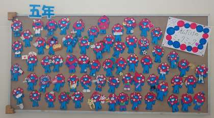 5年生のテーマは「私だけのミャクミャク」。よく見ると、ミャクミャク一人一人が、持っているものが違うんです。野球が好きな人はバットとグローブを、本が好きな人は、本を持ったミャクミャクを作りました。