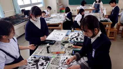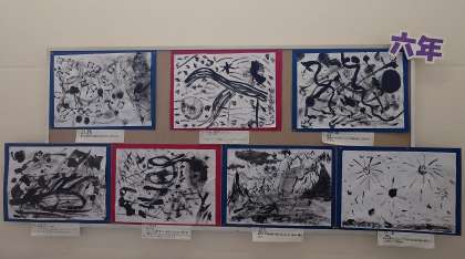 6年生のテーマは「墨絵DEアート」。習字で使う墨汁を、筆や段ボール、歯ブラシ等を使って思い思いに表現し制作しました。