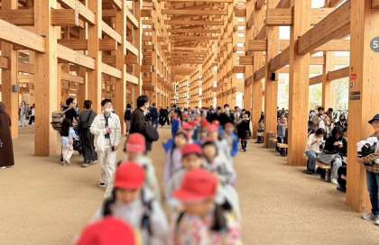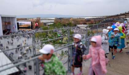 1〜3年生は、まず大屋根リングの上に登って、上からの眺めを楽しみました。