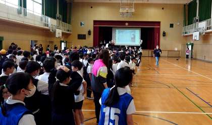集会委員会の人の司会で、「〇?ゲーム」が始まりました。1年生にも学校の場所の名前を覚えてもらおうというねらいです。