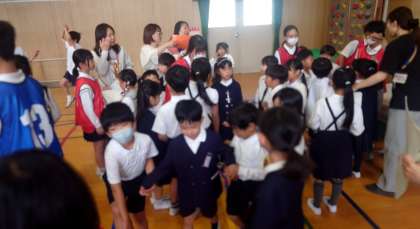 「この部屋は職員室である。〇か?か。」という問いかけに、みんな一斉に右の?か、左の〇に移動します。