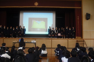 1月28日(木)児童集会は、手作りクラブの発表でした。クラブ活動の時間に、自分が作った小物(布を糸で編上げたものなど)を全校児童に披露していました。
