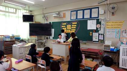 その後、教室で、ふわふわ言葉をたくさん集めました。「ふわふわ言葉がたくさんになると、きっとみんなで話し合ったようなすてきなクラスになるよね!」と担任が、クラス目標の掲示を指しながら話すと、みんな大きくうなずいていました。