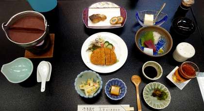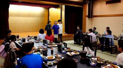 新鮮なお造りなど、たくさんのおかずが並びました。活動班ごとに座って、今日の楽しかった出来事を振り返りながら、美味しくいただきました。