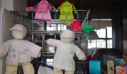 給食当番が、給食を取りに来てくれました。児童だまりには、折り紙の得意な給食調理員さんが、いろいろな飾りを作って飾ってくれています。これは、「武士ロボット」。ランドセルを背負っていますね。一枚の紙から作っているそうですよ。
