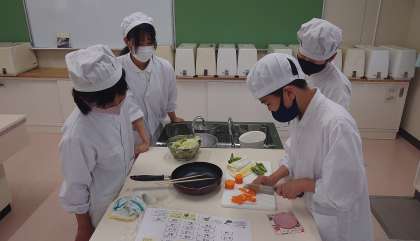 フライパンでいためて、塩コショウして、味を整えたら盛り付けです。空いた時間には、片付けをするなど手際も良く進めていました。
