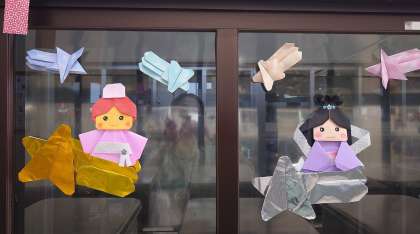 給食室の前の児童だまりに、給食調理員さんが、折り紙で、季節を感じる飾りを作ってくださいました。