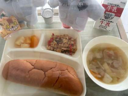 今月の給食に、「押麦のチキンパエリア」が出ます。