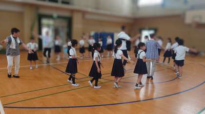 100人を超える子どもたちが集まりました。「福島区民音頭」や「ギザギザハートの子守唄」「ダンシングヒーロー」等の曲に合わせた踊りで、子どもたちはすぐに振りを覚えて、楽しそうに踊っていました。最後に、全員で一つの輪になって踊りました。