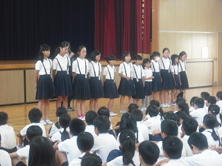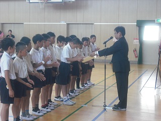 今日の朝会では、まず昨日開催された区子連のキックベースボールとソフトボールの大会で活躍した子どもの表彰をしました。女子のキックチームは準決勝で惜しくも敗れ3位でしたが、良く頑張りました。男子ソフトチームは3試合行い、すべて快勝し、見事に優勝の栄冠に輝きました。その賞状や優勝旗、優勝杯を全校の前でお披露目し、みんなで選手に拍手を贈りました。努力の積み重ねがこうした結果を生むことを話しました。次に、学校に寄せられた地域の人からの手紙を紹介しました。それは、自分の知らない子どもから「おはようございます。」のあいさつをされたことへの嬉しさのお手紙でした。今後も地域の方や来校された方へのあいさつを進んでできる子になってほしいと言いました。
