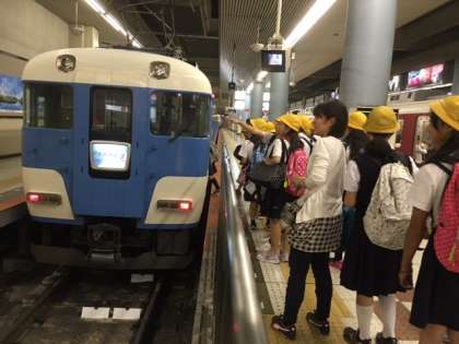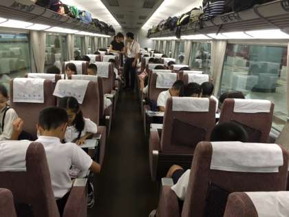 いよいよ修学旅行が始まりました。上本町駅からあおぞら号に乗りました。車内は4人の席で、仲良くお話やゲームを楽しんでいます。