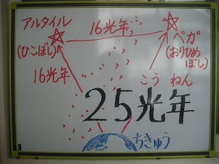 今週は、朝からとても暑いスタートとなりました。風邪気味の子どもも増え、少し心配です。さて、今日は「25光年」のお話です。今週は7日が七夕です。それで、星の話。七夕の主人公おりひめ星(こと座のベガ)は地球から約25光年の距離にあります。子ども達にその遠さを知ってもらおうと、光の速さの話をしましたが、少し難しかったように思います。ひこ星(わし座のアルタイル)とおりひめ星の距離は約16光年です。天の川を挟んで遠い出会いですね。大阪では1等星でさえよく見えませんが、たまには夜空を眺めてほしいと話しました。