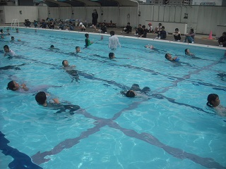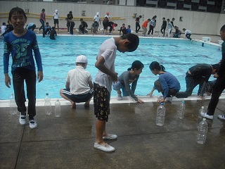 7月4日(月)午後から5・6年生が着衣水泳の学習をしました。水着の上から予め用意してきた普段着を着て、水の中でどのぐらい泳ぎにくいかを体感し、万が一の水難事故に備えるのが目的です。「服を着ていると泳ぎにくい。」「体が重くて沈んでしまう。」などの声が出ました。そのまま1分間浮いていられた子は数名でした。そして、今度はふたを閉めた空のペットボトルをもって同じことをすると8割程度の子が1分間浮くことができました。ペットボトル1本で命が救えるかもしれないことを実感しました。