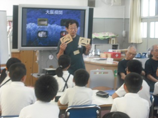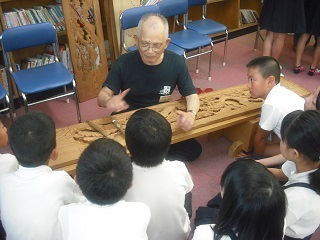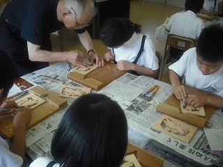 7月5日(火)5年生が伝統工芸品の「大阪欄間」の体験学習をしました。まず、2時間目に大阪欄間について、その歴史や作り方、苦労などについてDVDを見たり、6名の大阪欄間工芸協同組合の方からお話や実演を見聞きしたりしました。そして、3・4時間目はいよいよ欄間の体験制作、予めウサギと月の型抜きをした木工の素材を子ども達が彫刻刀で立体感が出るように彫り進めていきました。工芸士の方にアドバイスを頂きながら、上手にミニ欄間ができました。どこに飾ろうかなあ。