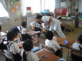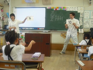 続いて、1年2組です。同じく初対面でしたが、みんな楽しそうに英語活動に取り組みました。