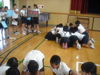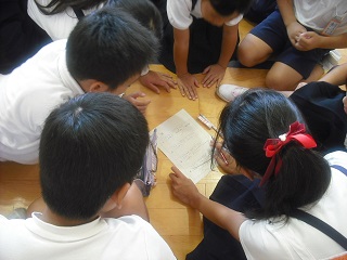 10月6日(木)昨日の台風の空模様とはうって変わり、朝から涼しく良い天気となりました。児童集会ではスマイル班ごとに「答えがいっぱいあるクイズ」に取り組みました。「日本のプロ野球チームの名前をすべて答えましょう」や「大阪環状線の駅名をすべて答えましょう」などの問題を集会委員が出し、スマイル班で相談して1分以内にできるだけ多く答えるクイズでした。それぞれ仲よく相談してたくさんの答えを書いていました。