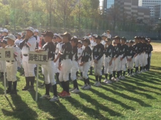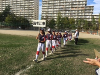 10月16日(日)晴天の下、福島区ライオンズクラブ杯キックベースボール、ソフトボール大会が下福島グラウンドで行われました。海東子ども会のキック・ソフトの両チームは共に堂々と開会式に臨みました。