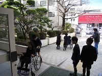 次に3人一組になって乗る人とおす人を交代しながら、実際に学校を一回りです。狭い通路の通行や段差があるときの安全なおし方について学びました。