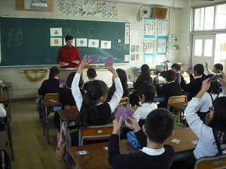 12月2日(金)今日も2・4年生が外国語活動の学習をしました。講師のマッツさんに教えてもらいました。野菜や気持ち、形、施設の名前を英語で言うゲームを楽しくしました。