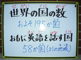12月12日(月)今日の朝会では「世界の国の数はいくらぐらいあるでしょうか?」という質問からお話をしました。答えはおよそ195か国。次に、そんな多くの国の中で、「おもに英語を話す国の数は?」という質問をしました。正解は、58か国(21の地域)だそうです。一緒に朝会に参加してくれたC-NETもカナダ出身であることを言いました。世界地図を見せながら、どんな国があるかを確認するとともに、外国語を学習していることが、将来いろんな国の人と知り合いになるために大切で役立つことを話しました。