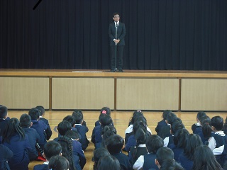平成29年(2017)1月10日、今日から3学期がスタートしました。朝の登校では、みんな大きな声であいさつして登校しました。その後、講堂で3学期の始業式を行いました。今日は、教頭先生が話をしました。一つ目の話は、今日からでもいいので、目標を持って頑張って欲しいということ。二つ目は、4月からは新しい学年になるので、一歩成長した行動が取れるように今日から準備するということ。三つ目は、校長先生が年度初めに掲げられた目標を改めて確認し、3学期を送るようにすること。以上の3つの約束をしました。これらの約束を守り、一人一人が目標を持って頑張って欲しいと思います。