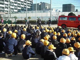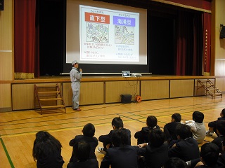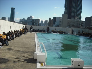 1月14日(土)土曜授業として、「海東防災Day」を行いました。まず最初に、福島区役所の方から地震のことについて、写真や動画、絵などをもとにお話を聞きました。その後、地震・津波の避難訓練をしました。津波を避けるために屋上のプールにも上がりました。