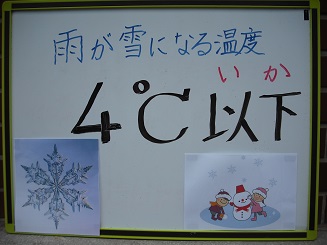 1月16日(月)大変寒い朝を迎えました。運動場の気温は3°Cでした。そこで、今日は「4°C以下」という数字から話をしました。これは地上の気温が大体4°C以下になると、雨ではなく雪が降るようです。様々な六角形の雪の結晶や雪のでき方を話しながら、自然現象の不思議さに興味をもってほしいと言いました。