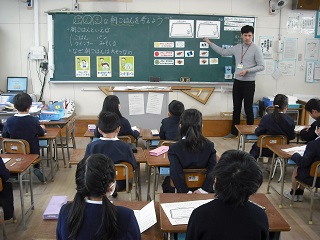 2月7日(火)、2・3時間目に栄養教諭の先生をお招きして、2年生に食育についての学習をしてもらいました。元気な朝ごはんを考えようという内容で、一日の活動のためには、栄養のバランスを考えてしっかりと朝ごはんを食べることが大切であることを学習しました。