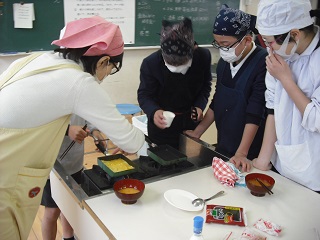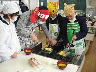 2月8日(水)5年1組の子ども達が調理実習をしていました。「卵をつかった料理」でたまご焼きをグループで協力して作りました。とても上手に焼き、美味しかったです。