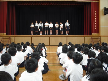 5月11日(木)児童集会で、委員会の代表の児童が、自分たちの委員会の活動について紹介をしました。また、聞いている全校の児童にお知らせやお願いもしていました。