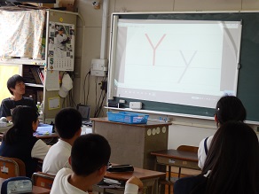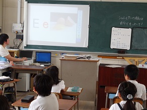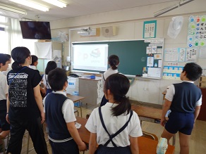 本校では各学年、午後の清掃活動の後に、モジュール(ABタイム)として15分間、週に3回英語に親しむ活動をしています。フォニックスやジングルなど電子黒板を活用しながら楽しく学んでいます。