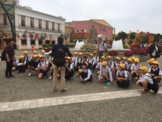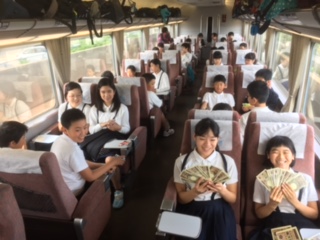 電車の中では、トランプや会話をして楽しみました。宿舎の送迎バスに乗り換え、いよいよ志摩スペイン村に入りました。