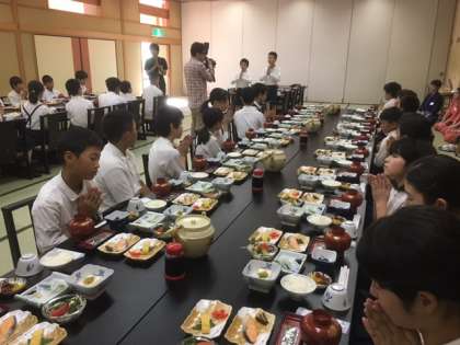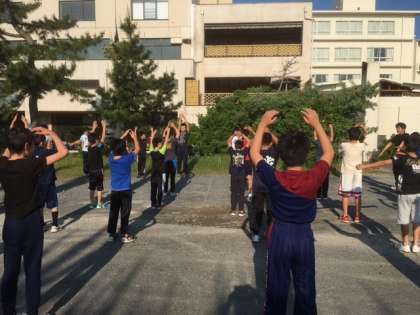 おはようございます。修学旅行二日目の朝を迎えました。早くに海から太陽が昇り、全員元気に活動が始まりました。ホテルと海岸の間の広場で朝の会と体操をした後、これまたおかずいっぱいの朝食をとりました。