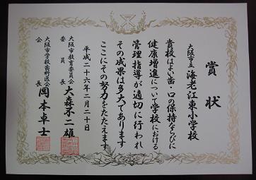 本校が2月20日、大阪市教育委員会・大阪市学校歯科医師会から「よい歯の学校」として表彰されました。