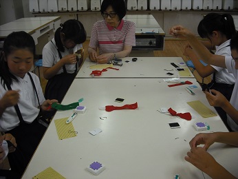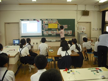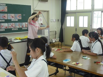 6月7日(水)家庭科研究授業「はじめてみよう ソーイング」を、5年生で行いました。針と糸を使って、玉結び・玉止めができることをめあてに授業を展開しました。子ども達によく見えるように、手順拡大図で説明したり、ビデオを見せたり、菜箸や毛糸を活用して実演したりして取り組みました。最初は難しそうにしていた子どもも、先生が個別に指導することで、最後にはほとんどの子が上手にできるようになりました。