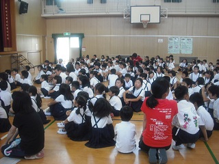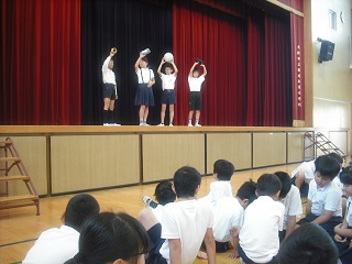 6月15日(木)の児童集会は動体視力ゲームでした。講堂の舞台の幕と幕の間を飛ぶもの(ボールやガムテープなど)を答えます。一瞬なので、なかなか難しいです。それでも、さすが子どもたち!スマイル班で相談して次々と当てていきました。