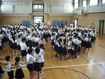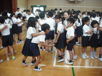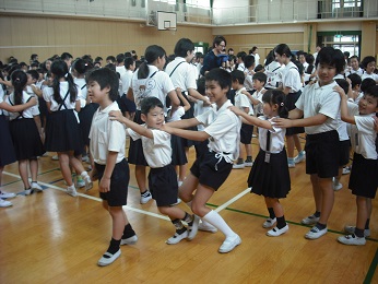 7月6日(木)今日の児童集会は、「じゃんけん列車」でした。異学年の児童が互いにじゃんけんをして、負けた子が勝った子の肩に手を置きつながります。音楽が流れている間につながったまま移動し、次の相手を見つけて音楽が止まったら先頭同士でじゃんけんをします。こうして、2人から4人、8人とだんだん長い列(列車)になっていきます。何度かして最後までじゃんけんに勝って先頭にいる子にみんなで拍手をしました。