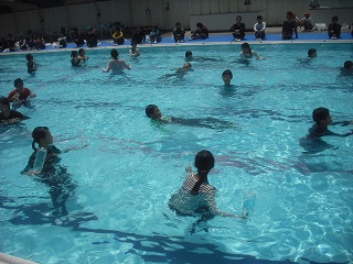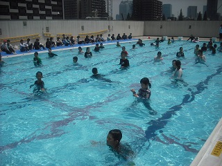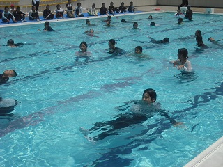 まず長袖長ズボンを着用して、水の中に入ると、体の動きが制限されて泳ぐことが困難になることを体感しました。その後、着衣やいろいろなものの浮力の助けを借りて水に浮く方法を体験しました。今日はペットボトルを使って浮く練習をしました。