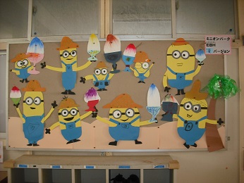 なかよし学級は木曜日の1時間目、なかよしタイムをしています。今回は「なかよし交流会でつくる物をなににするか」の話合いでした。みんな自分の考えを発表しながら、作るものを一つにまとめていました。学級の前の掲示板にはミニオンのかき氷が貼ってあります。