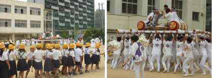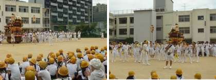 7月18日(火)今日は、学校の近くにある海老江八坂神社の夏祭り本番の日です。朝から学校へ北之町の枕太鼓と東之町のだんじりが入ってきました。子ども達が綱を引いて運動場を移動した後、代表の方から祭りに関するお話をいただきました。その後、大勢の方で担ぎ上げるパーフォーマンスも行われ、子ども達から大きな拍手が起こりました。今日は夜まで海老江の町は祭り一色です。