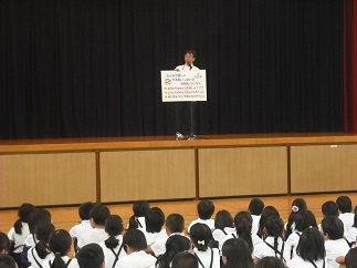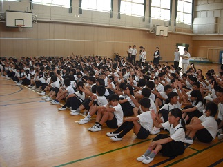 7月20日(木)朝から講堂で、1学期の終業式を行いました。最初に、1学期の学校生活を振り返って、学習や友だち関係、健康・体力について、やる気を持って頑張れたかをA・B・C・Dの4択で自己評価しました。多くの子が「よく頑張った」「まあ頑張った」に手を挙げ、進んで取り組むことができたようでした。
