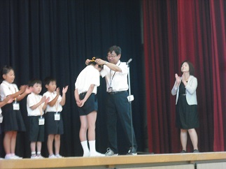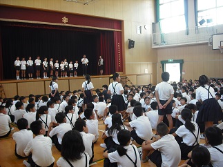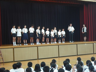7月20日(木)終業式では、1学期に各学級で特にあいさつを元気にしていた「あいさつチャンピオン」を選び、表彰をしました。以前の「あいさつチャンピオン」ともコラボして、みんなでその頑張りを称えました。これからもあいさつの輪が広がることを期待しています。