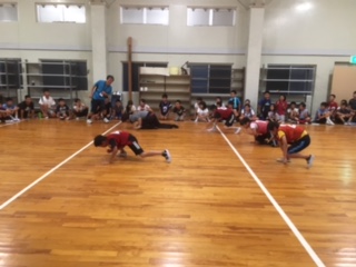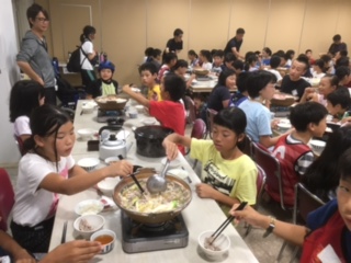 雨天のため、予定していたアスレチックとナイトハイクは中止し、入浴を早めました。そして、晩御飯のカモ鍋をしっかり食べたあと、室内オリンピックを楽しみました。