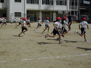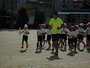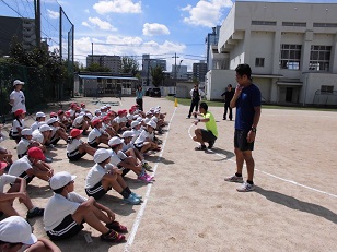 9月13日(水)福島区の体力向上事業として、陸上競技のアスリートの方2名が来られました。走り幅跳びの荒川さんと、十種競技の宮川さんです。お二人から速く走るためのコツを実演を交えて教えてもらいました。まずは、3・4年生でした。一生懸命頑張っていました。