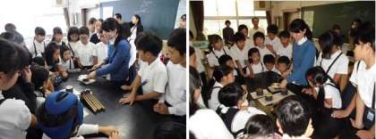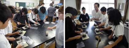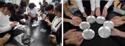 10月6日(金)5年生が、伝統工芸の体験学習で、大阪錫器の方に来ていただき、教えてもらいました。作るものは錫製のお皿です。まず、錫の円盤を10種類の型のついた金づちで叩きながら模様をつけていきます。次に、丸くへこんだ木の台の上で、円盤を木づちで叩きながらお皿の形に変えていきます。最後に、スチールウールで磨き、布できれいに仕上げて完成です。初めての体験でしたが、でき上がった錫器の自分だけのお皿にみんな嬉しそうでした。大阪錫器の皆様ありがとうございました。