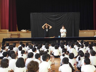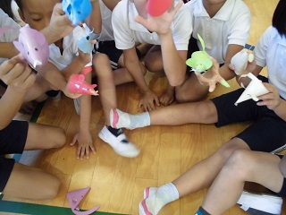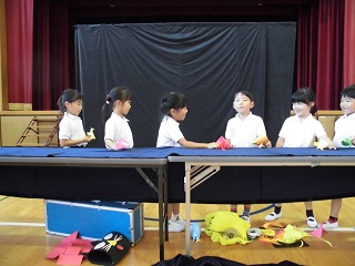 10月10日(火)人形劇団クラルテの方に来ていただき、ワークショップをしていただきました。自分で作った人形をつかって、コミュニケーション力を高めることをねらいとしています。2.3時間目は1.2年生が体験しました。紙を円の形に切り、そこから円錐をつくり、ネズミを作りました。ひとりひとりいろいろな色や形のネズミができあがりました。そのあと、そのネズミをつかって、自分の思いを伝えあう活動をしました。