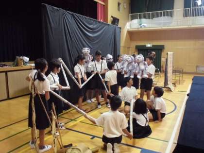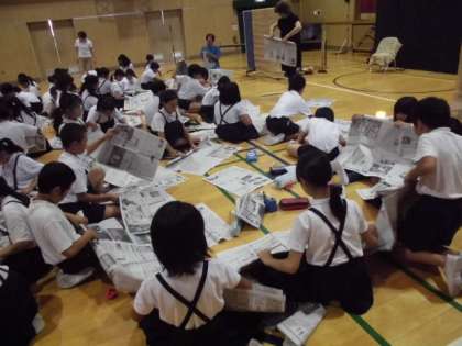 10月10日(火)5.6時間目は5年生がワークショップに参加しました。新聞を丸めて筒状にして、グループでその筒を組み合わせて、思い思いの形を作りました。その形に、「11ぴきのねこ」の話に登場するネコのパペットを参加させ、一つのストーリーを生み出す活動を行いました。各グループ、いろいろな楽しいストーリーが出来上がりました。